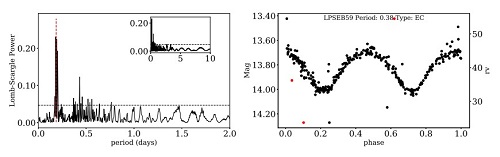 图2:双星(LPSEB59)的Lomb-Scargle周期谱分布(左图)和按照最佳周期折叠的光变曲线(右图)。左图中的黑色实线为周期显著度置信线。右图的黑点表示测光光变曲线,红点表示LAMOST测得的视向速度按照星历推算的相位分布。