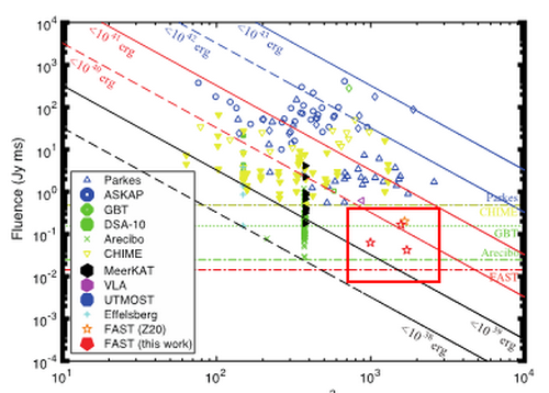 澳大利亚香农(Shannon)博士等比较了帕克斯望远镜和澳大利亚平方公里先导阵的快速射电暴样本比对分析,得出FRB的流量通量(Fluence)与色散(Dispersion Measure, DM)存在一定的关系(Shannon et al. 2018)。FAST探测到的这几例FRB事件具有流量通量低,色散值高的特点,填补了FRB的Fluence-DME相图中空白,补充验证了Fluence-DME反相关的关系。结合模拟计算表明,FAST探测的FRB样本可以延展到z>3,并且其色散分布将能约束FRB的本征光度函数,从而帮助我们揭开此类暴发现象的神秘面纱。