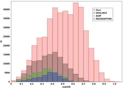 同时,上海交通大学的杨小虎教授等人和邹虎合作采用了改进的基于暗物质晕的星系群搜索算法,也成功探测到了相似规模的星系团(成员数量大于10)。该工作近期被《天体物理学报》接收。综合两种不同的探测方法能够给出更加可靠的星系团和成员判断,有利于分析不同星系团探测方法对各项研究带来的系统影响。