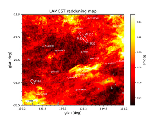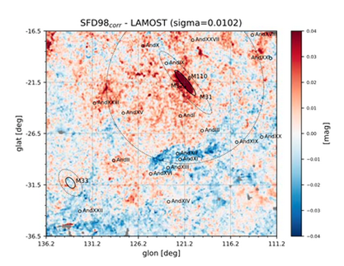 利用来自郭守敬望远镜(LAMOST)和Gaia卫星的约19万颗恒星数据,利用恒星配对的方法精确测量恒星消光,两位研究者在M31和M33区域构建了一个范围大且精确的银河系二维前景尘埃红化图。