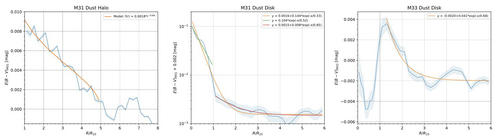 左、中、右图分别展示了 M31尘埃晕、M31尘埃盘和M33尘埃盘消光的径向趋势。其中蓝色实线为观测值,阴影表示3σ误差范围。