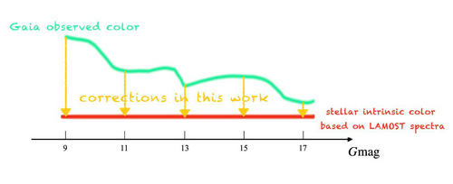 研究人员首先将LAMOST与Gaia数据进行交叉,从中选取观测质量足够高且消光值足够小的数据,将其分为主序矮星和红巨星样本,选择其中G星等在13.3到13.7范围内的恒星作为参考样本,利用该参考样本建立恒星大气参数(有效温度、金属丰度、表面重力加速度)与内禀颜色之间的关系。接着将该关系应用于全体样本,改正尘埃效应以后,得到观测颜色和模型颜色之差随G星等的变化趋势,并将这一趋势作为修正曲线。