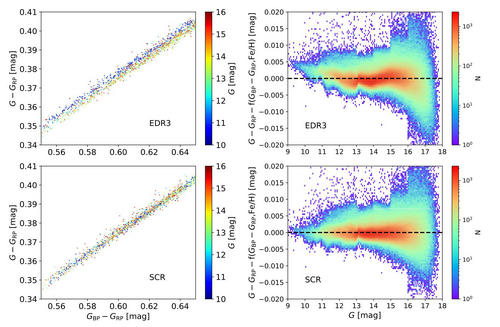 左边为Gaia EDR3修正前后的颜色颜色图;右边为Gaia EDR3修正前后的颜色残差随星等的变化情况。