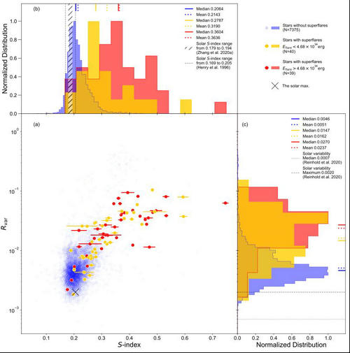 在图2当中,研究人员将爆发了超级耀斑的恒星(红色、黄色数据点)与没有爆发超级耀斑的恒星(蓝色数据点)进行了区分。他们发现爆发超级耀斑的那些恒星要比没有爆发超级耀斑的恒星具有更高的色球活动程度,同时也具有更高的表面黑子占比。此外,他们发现爆发超级耀斑的类太阳恒星同太阳相比具有更剧烈的色球活动以及更大的黑子覆盖率。