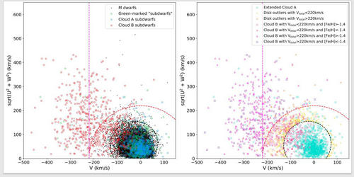 基于Gaia DR2数据,该团队计算了亚矮星样本的银河系运动坐标系(U, V, W)上的空间速度分量及其弥散,并将样本按照参数和运动学特性分别分组进行了进一步分析。结果表明,在太阳附近采样的本地银河系晕族亚矮星具有高引力和不明显的双峰金属丰度分布,并且有一部分具有围绕银河系旋转的顺行轨道。其余的亚矮星则部分属于厚盘成分,同时有很大一部分与薄盘、中度贫金属星杂乱地混合在一起。进一步的研究或能揭示出银河系的演化历史,这需要每颗单星的轨道和更精确的参数,并确保去除选择效应、多体系统和参数耦合造成的污染。