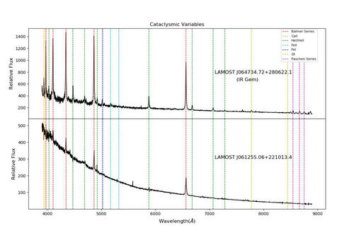 天文学家是如何搜寻这类天体的呢?激变变星,作为双星系统,在光谱上表现出显著的发射特征,作为变星,在光度上有明显的星等变化,这些独特的性质为搜寻这种特殊天体提供了有迹可循的观测依据。