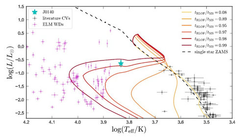 LAMOST在不同夜晚对该天体进行了多次观测,研究人员发现该天体不同时间的视向速度之间存在每秒数百公里的差异。为了完全确定其轨道和相关属性,研究团队又借助美国利克天文台的Shane望远镜进行了后续观测,同时也利用了欧空局的盖亚卫星(Gaia)天体测量数据以及其他一些测光巡天的数据进行了分析,研究人员最终发现该新天体是一种罕见的、正处于演化过渡阶段的激变变星,其中的伴星并不是主序星,而是一颗正在膨胀的恒星氦核。并且基于双星演化模型推测,这颗激变变星的伴星开始向白矮主星进行质量转移时,就已经结束了主序阶段并经历了很明显的演化过程。另外,通过演化模型计算,该团队预测此双星的质量转移将很快结束,此后该伴星将演化成为一颗极低质量的白矮星。可以说,这颗激变变星的伴星正处于一颗恒星氦核和极低质量白矮星之间的过渡状态(图3)。而这颗特殊天体的最终命运可能演化成为一颗具有极短轨道周期(5~30分钟)的双致密天体(AM CV系统——激变变星的一种子型)。在这之前,理论上曾预测存在此类过渡型的激变变星,但是从未被观测到,LAMOST凭借自身在搜寻稀有天体方面的优势首次观测到了它的存在。