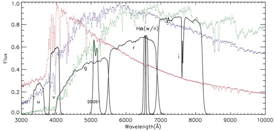 为弥补光谱巡天获取恒星参数数目(500万量级,以我国LAMOST光谱巡天为代表)与天测巡天数目(10亿量级,以欧空局Gaia卫星为代表)的量级差异,SAGES项目采用一套对恒星大气参数敏感的独特滤光片系统(包括uSC, vSAGE, g, r, i, Hαn, Hαw 和 DDO51共 8 个波段,见图1)以测光方式获取海量恒星的物理参数(包括有效温度 Teff、表面重力 log g 、金属丰度 [Fe/H]、距离和年龄等),从而显著推进对银河系结构、化学和运动学性质的全面理解。