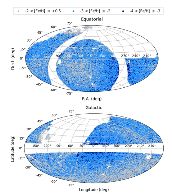 图3:SAGES(北天)和SkyMapper(南天)参数星表中贫金属星的空间分布(取自arXiv:2311.02297)