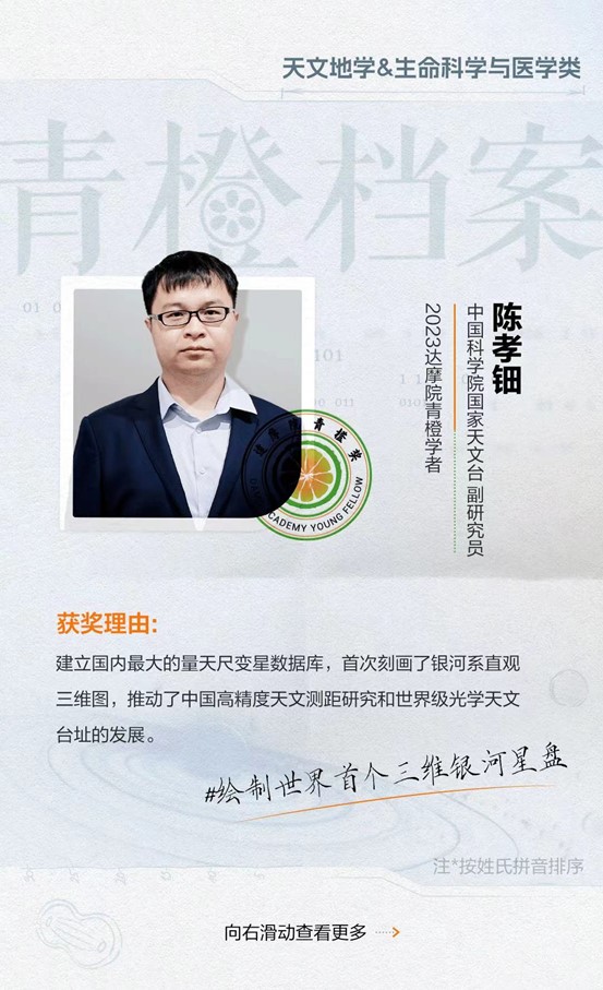 12月27日,阿里巴巴达摩院青橙奖组委会公布2023达摩院青橙奖名单,经过严格的初审、通讯评审、现场答辩,共15人获奖。中国科学院国家天文台陈孝钿入选“2023达摩院青橙奖”,并获得“青橙学者”称号。