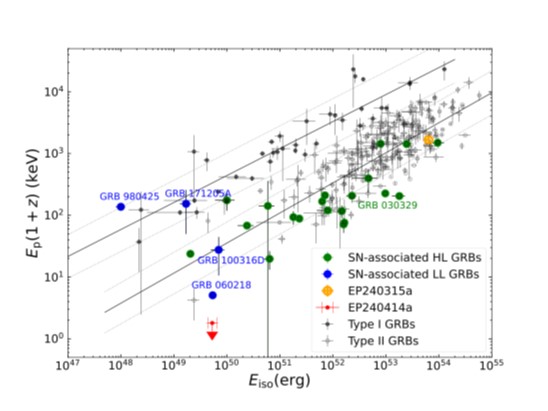 峰值能量与各向同性能量关系图(Amati关系)。EP240414a相较于经典伽马射线暴及部分低光度伽马暴呈现显著偏离特征。