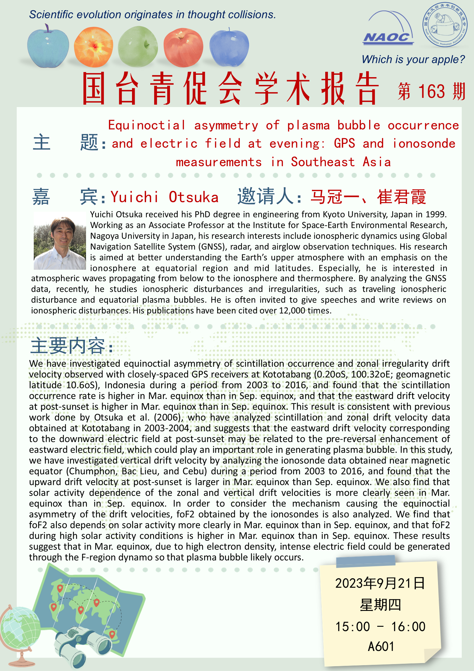 [Seminar]Equinoctial asymmetry of plasma bubble occurrence and electric field at evening: GPS and ionosonde measurements in Southeast Asia
