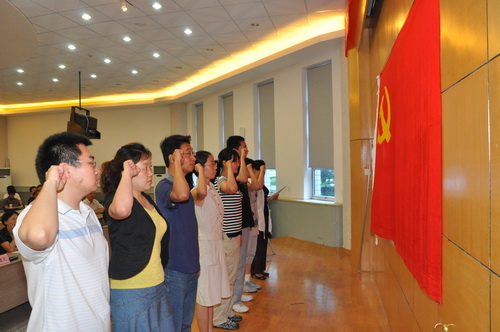 在鲜红党旗的映衬下,多功能厅熠熠生辉,台内100多名党员庄严落座。郑晓年首先宣读了《关于表彰京区先进基层党组织、优秀共产党员和优秀党务工作者的决定》,国家天文台兴隆/LAMOST党支部、郜双喜同志和李春来同志榜上有名。随后宣读了《中共国家天文台委员会关于表彰2008­­­—2009年度先进党支部和优秀共产党员的决定》,评选太阳党支部、恒星/星系党支部和退休四党支部为国家天文台2008—2009年度先进党支部;评选王华宁、王俊杰、艾国祥、陈玉琴、张洪波、汪景琇、朱元诜、李竞、洪斯溢9位同志为国家天文台2008—2009年度优秀共产党员。获得表彰的党支部书记和党员在《团结友谊进行曲》的雄壮节奏中,接过了象征荣誉、表示肯定又充满期待的证书。党委书记刘晓群号召各党支部和全体共产党员向受到表彰的先进党支部和优秀共产党员学习,以实际行动促进创先争优取得实效,为顺利启动和实施“创新2020”提供可靠保证。随后,到会的预备党员在综合办公室主任陆烨的带领下,面对党旗庄严宣誓:“我志愿加入中国共产党,拥护党的纲领,遵守党的章程,履行党员义务,执行党的决定,严守党的纪律,保守党的秘密,对党忠诚,积极工作,为共产主义奋斗终身,随时准备为党和人民牺牲一切,永不叛党。”嘹亮的声音回荡在会场,使在座的每一位党员再一次重温了入党誓词的威严与神圣,面对党旗再一次反省自己。