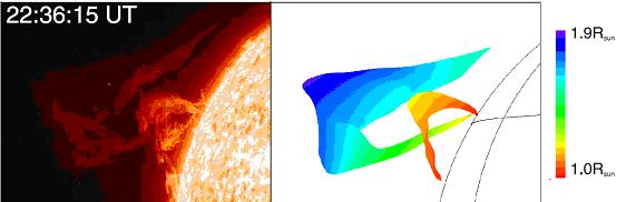 图1:观测暗条和重构暗条对比图。左图代表STEREO A 观测的爆发暗条,右图代表从STEREO A视角看到的重构暗条,彩色代表离日面的高度.