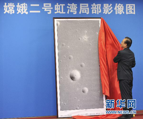 探月工程嫦娥二号月面虹湾局部影像图揭幕仪式11月8日上午在北京举行。中共中央政治局常委、国务院总理温家宝出席揭幕仪式并为影像图揭幕。