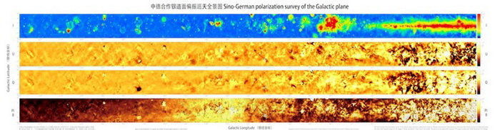 图1. 利用新疆天文台25米望远镜由中德合作观测得到的银道面偏振巡天全景图