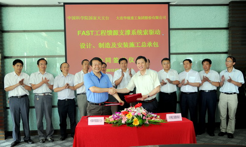 7月6日,FAST工程馈源支撑系统索驱动设计、制造及安装施工总承包合同签约仪式在大连华锐重工集团股份有限公司国际会议厅举行。国家天文台台长、FAST工程经理严俊,FAST工程总工程师南仁东、总工艺师杨世模和大连华锐重工集团股份有限公司总裁贾炜晶、副总工程师郭胜伟以及双方的相关领导和工程技术人员参加了签字仪式。严俊和贾炜晶分别代表双方在合同上签字,签字仪式由集团副总经理邹胜主持。