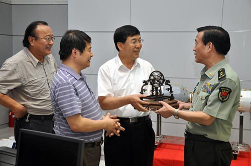 王洪尧政委一行向国家天文台赠送神舟九号与天宫一号对接模型。