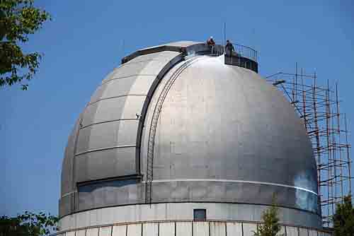刚刚清洗干净的圆顶,基地工作人员和施工方工人正在一起开展2.16米望远镜圆顶的重新油漆工作。
