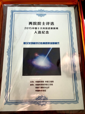 其中,国家天文台科研成果“首次发现相对论性高速喷流新模式”入选。国家天文台研究员刘继峰带领团队在国际上首次从超软X射线源发现相对论性高速喷流,打破了天文学界以往的认知,揭示了黑洞吸积和喷流形成的新方式。该成果发表于《自然》杂志。审稿人认为,此项工作是2015年度本领域内最重要的5大发现之一。“在超软X射线源中发现相对论性喷流出乎所有人的意料,这改写了我们对超软X射线源的认知和喷流形成的认知。”美国科学院院士、英国皇家学会院士、哈佛大学教授Remash Narayan评论说:“它的观测特征和人们猜想并进行了大量数值模拟的处于极高吸积率的黑洞完全契合,生动展示了黑洞吞噬物质过多后产生高速重子喷流和浓密吸积盘外流的情况。”