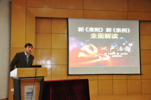 述职报告后,党委副书记郑晓年围绕全面从严治党,就《中国共产党廉洁自律准则》和《中国共产党纪律处分条例》(以下简称《准则》和《条例》)做了专题报告。郑晓年从修订《准则》和《条例》的必要性,修订《准则》和《条例》的基本原则,准确把握《准则》的精神实质,《条例》主要内容解读,认真学习执行《准则》和《条例》等五个方面,进行了详细解读。《准则》8条,坚持全面倡导、重在立德,是党员和党员领导干部能够看得见、够得着的高标准;《条例》133条,围绕党纪戒尺要求,开列“负面清单”、重在立规,划出了党组织和党员不可触碰的“底线”。报告使与会的每一位党员都受到了深刻的党性教育,进行了一次思想的洗礼。郑晓年指出,《准则》和《条例》既是对党的各级组织的有力约束,也是全体党员要遵循的基本守则,希望全体党员同志,把学习《准则》和《条例》与学习党章,贯彻党的十八大和十八届三中、四中、五中全会精神,学习贯彻习近平总书记系列重要讲话精神紧密结合起来,增强担当意识和担当能力,做到内化于心、外化于行。党员领导干部更应发挥表率作用,坚持以严的标准要求自己、以严的措施管理自己、以严的纪律约束自己,做到心有所畏、言有所戒、行有所止。