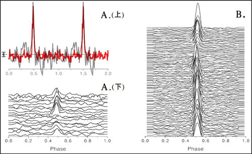 新脉冲星的归一化平均脉冲轮廓和单脉冲。A(上)为FP1平均脉冲轮廓,FAST通过约52.4秒漂移扫描(红色)产生信噪比为Parkes望远镜L波段积分2100秒结果(灰色)信噪比的3倍,表现出FAST高灵敏度优势。A(下)为FP1单脉冲轮廓。B为FAST采用跟踪观测5分钟,获得的另一颗新脉冲星FP2的单脉冲轮廓。