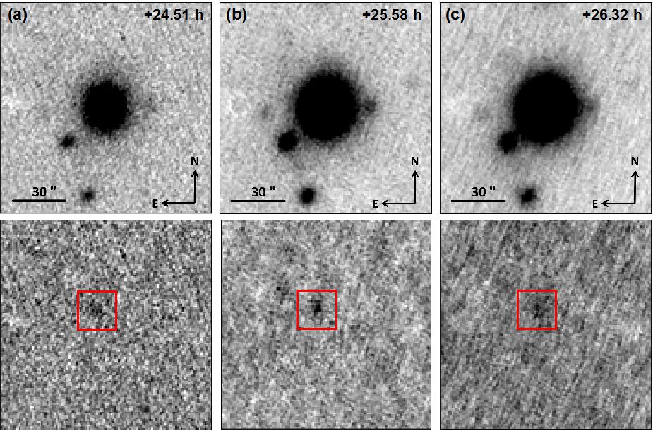 AST3-2在8月18日观测窗口期内引力波光学信号(红色方框内),上图是观测图像,下图是与模板相减后的图像。
