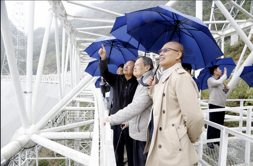 10月18日,国际著名物理学家、诺贝尔奖获得者杨振宁,美国圣塔芭芭拉加州大学校长杨祖佑,美国圣克鲁斯加州大学林潮教授等专家一行赴500米口径球面射电望远镜(FAST)工程现场参观交流。