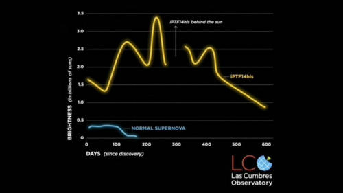 超新星iPTF14hls在两年的时间里至少有五次变亮和变暗。这种行为从未见过;超新星通常会在大约100天内保持明亮,然后逐渐消失。(LCO/S. Wilkinson.)