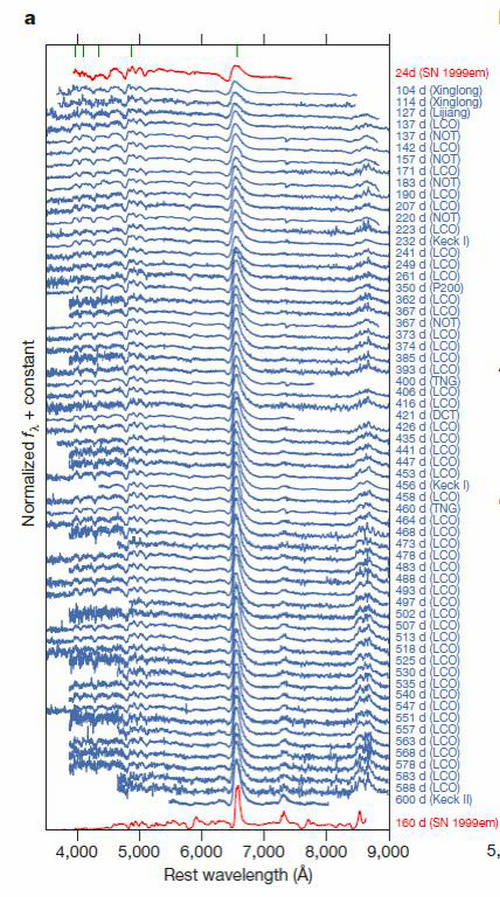 超新星iPTF14hls的光谱演化序列。其中蓝色为超新星iPTF14hls完整的光谱序列,红色为用作对比的II-P型超新星SN 1999em的光谱。横坐标为实验室静止波长,右侧纵坐标标示出了各条光谱观测时对应的超新星iPTF14hls爆发后的天数及所使用的望远镜(其中“Xinglong”对应兴隆观测基地2.16米望远镜)。2.16米望远镜贡献了该光谱序列中最早的两条光谱。