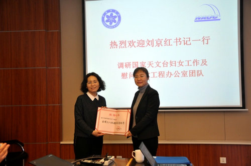 刘京红对国台“FAST工程办公室”团队荣获“全国三八红旗集体”荣誉称号表示亲切的慰问和衷心的祝贺,并宣读了全国妇联对FAST工程团队的表彰决定,向获奖团队颁发了证书。FAST工程办公室副主任张海燕代表团队接受了证书并介绍了FAST项目和工程办公室团队的工作情况。
