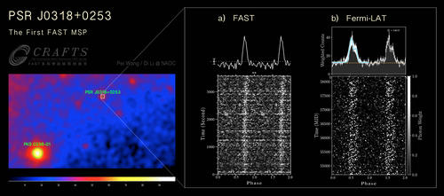 新发现的毫秒脉冲星PSR J0318+0253位置和积分脉冲轮廓。(左图)PSR J0318+0253所在伽马射线巡天图像的位置;(右图aFAST一小时跟踪观测获得的射电波段积分脉冲轮廓;(右图b)折叠Fermi-LAT累积9年数据所获得的伽马光子积分脉冲轮廓。