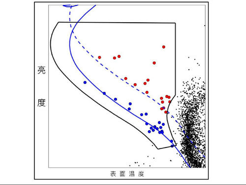 NGC 2173星团蓝离散星的亮度-表面温度的二维分布。每一个点代表一颗恒星或双星,黑点是NGC 2173的普通恒星。蓝色和红色圆点标出了两条恒星带上的蓝离散星。蓝色实线和虚线是理论模型预测的两支蓝离散星的位置。本文作者认为左边的蓝离散星带代表了同时形成的一批蓝离散星。