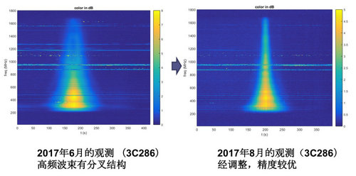 随着调试工作的精雕细琢,把测量精度不断提升,望远镜的性能也得到明显改善。下面左图就是精度提升之前的望远镜波束形状,可以看到在高频段有明显的分叉结构,就像一个近视的天眼,看东西都是模糊的。而随着精度的提高,波束慢慢地变成下面右图的形状,可以在高频段实现完美的聚焦,完成天眼的视力校正。与此同时,漂移观测的指向精度已经达到10角秒的水平,这些都是非常可喜的进展。
