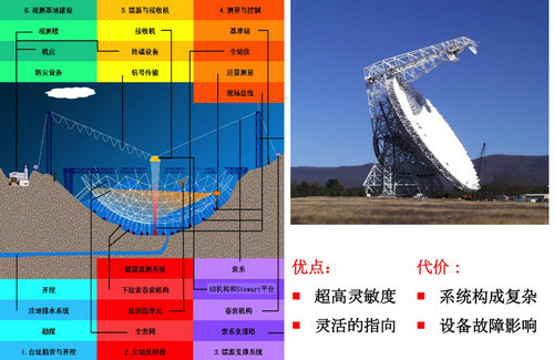 图1:FAST与传统望远镜的对比,明显看出FAST系统构成要复杂得多,也更容易受设备故障的影响。同时,还有30吨馈源舱漂在高空,安全风险极大。所以调试初期,我们更多关注的是安全方面的问题,一方面制定严格的安全措施确保安全操作,另一方面发展新的技术方法提高望远镜正常工作对设备故障的容忍度。