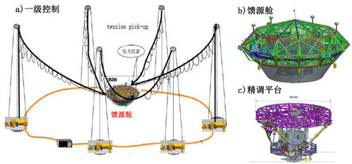 第一级是通过六根几百米的绳子对30吨的馈源舱实现的概略控制,要在140米高空、200多米的尺度范围内,把馈源舱定位精度控制在48毫米以内。