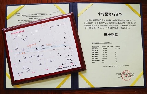为了弘扬丰子恺先生的艺术思想和文化成就,国际天文学联合会(IAU)小天体命名委员会于2020年6月3日发布第123451号小行星通报,将国家天文台发现的、国际永久编号为79811号小行星,命名为“丰子恺星”。这颗小行星与丰子恺先生有着天生的缘分,寓意深远;它发现于1998年11月9日,这天正好是丰子恺先生诞辰100周年纪念日;它的国际永久编号后4位数字是“9811”,也恰恰好是丰子恺先生的出生年月——1898年11月。
