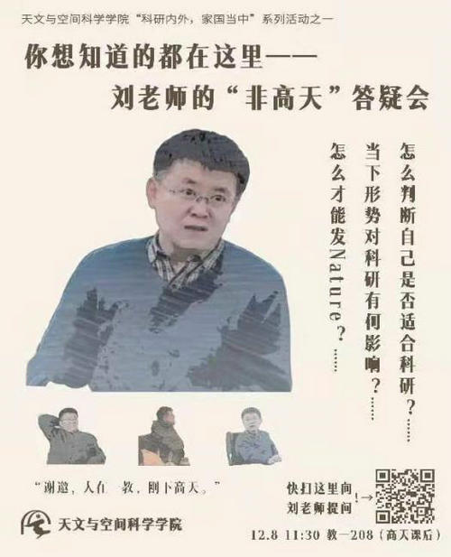 为加强当代研究生思想政治素养,落实思想教育工作,中国科学院大学天文学院于12月开展主题为“科研内外,家国当中”的思政教育系列活动。12月8日在雁栖湖校区举行了第一场别开生面的思政座谈活动:你想知道的都在这里——“NATURE刘”的答疑会。
