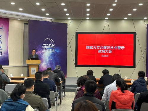 3月26日上午,国家天文台召开第一季度警示教育大会。台领导、党委委员、纪委委员、党总支和党支部书记、纪检委员、科研单元负责人、职能部门中层管理人员、课题秘书等台内职工110余人参加会议。会议由党委书记、副台长汪洪岩同志主持。