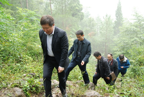 10月9日,曹健林副部长冒雨实地视察了FAST工程贵州黔南平塘县克度镇大窝凼FAST工程台址。