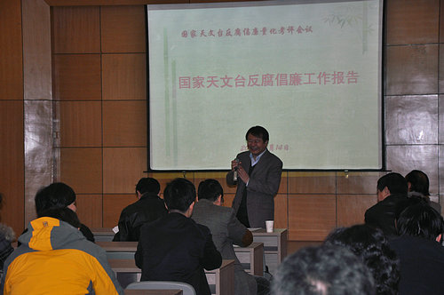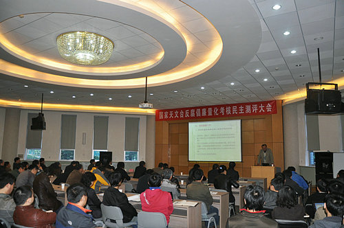 台长严俊代表台党政领导班子对考核组的到来表示欢迎并介绍与会的主要人员,台党委书记刘晓群从国家天文台领导班子开展工作情况、民主管理情况,领导干部廉洁自律情况以及宣传教育、重点领域制度建设、监督检查、信访查案、纪监审部门履行职责等八个方面全面总结了国家天文台2010年至2011年开展反腐倡廉工作的情况。之后,按照考评程序要求,全体参会人员认真填写并提交了民主测评表与调查问卷。