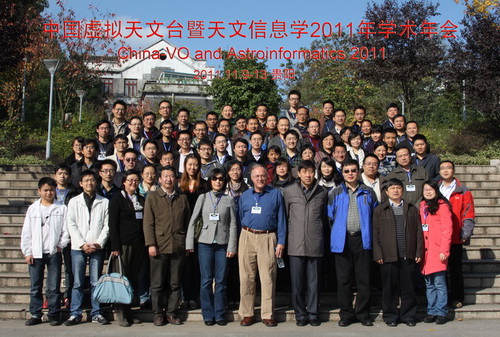 中国虚拟天文台暨天文信息学2011年学术年会于11月9日至13日在贵州省贵阳市举行。此次学术年会由国家天文台-贵州大学天文联合研究中心承办。国家天文台党委副书记、副台长郑晓年,副台长郝晋新,贵州大学副校长宋宝安,中科院基础科学局天文力学空间科学处副处长薛艳杰,中科院办公厅信息化工作处业务主管马晓莉出席开幕式并部分参加了随后的学术研讨。来自国家天文台、上海天文台、云南天文台、新疆天文台、紫金山天文台等天文台站,加州理工大学、微软研究院、北京大学、北京师范大学、广东外语外贸大学、贵州大学、华中师范大学、昆明理工大学、南京天光所、清华大学、三峡大学、天津大学、天津科技大学、天津师范大学、西安理工大学、重庆大学、赛龙/EMC公司、南京天仪公司等高校及研究机构的70多名学者参加了会议。