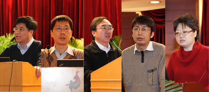 实验室部分学术带头人和科研骨干报告相关科研和国际合作研究进展         (左至右:薛随建、詹虎、罗阿里、吴宏、王益萍)