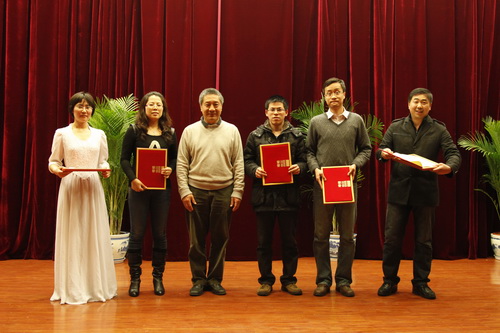 实验室学术委员会主任林潮为获得“中国科学院光学天文重点实验室2011年度优秀青年工作者”的获奖人员颁发荣誉证书(左至右:徐岩、李荫碧、林潮、白仲瑞、张天萌、王金虎)