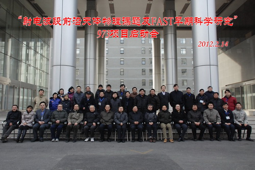 2月14日, “射电波段的前沿天体物理课题及FAST早期科学研究”973项目启动会在国家天文台召开。国家自然科学基金委员会数理学部常务副主任汲培文、中国科学院基础科学局局长刘鸣华、科学技术部基础研究管理中心负责人钱万强、国家自然科学基金委员会数理学部天文处处长董国轩、中国科学院基础科学局天文力学空间科学处副处长薛艳杰、973计划领域专家咨询组的黄珹和李宗伟两位专家、中国科学院国家天文台的周又元院士和武向平院士出席了会议。会议由郑晓年和李菂共同主持。